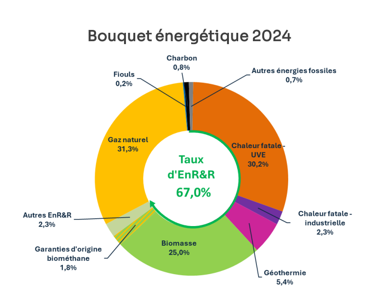 La chaleur livrée par les réseaux est majoritairement d’origine renouvelable ou de récupération (chaleur fatale issue des Unités de valorisation énergétique des déchets (UVE) et des industries, biomasse, géothermie, etc.).