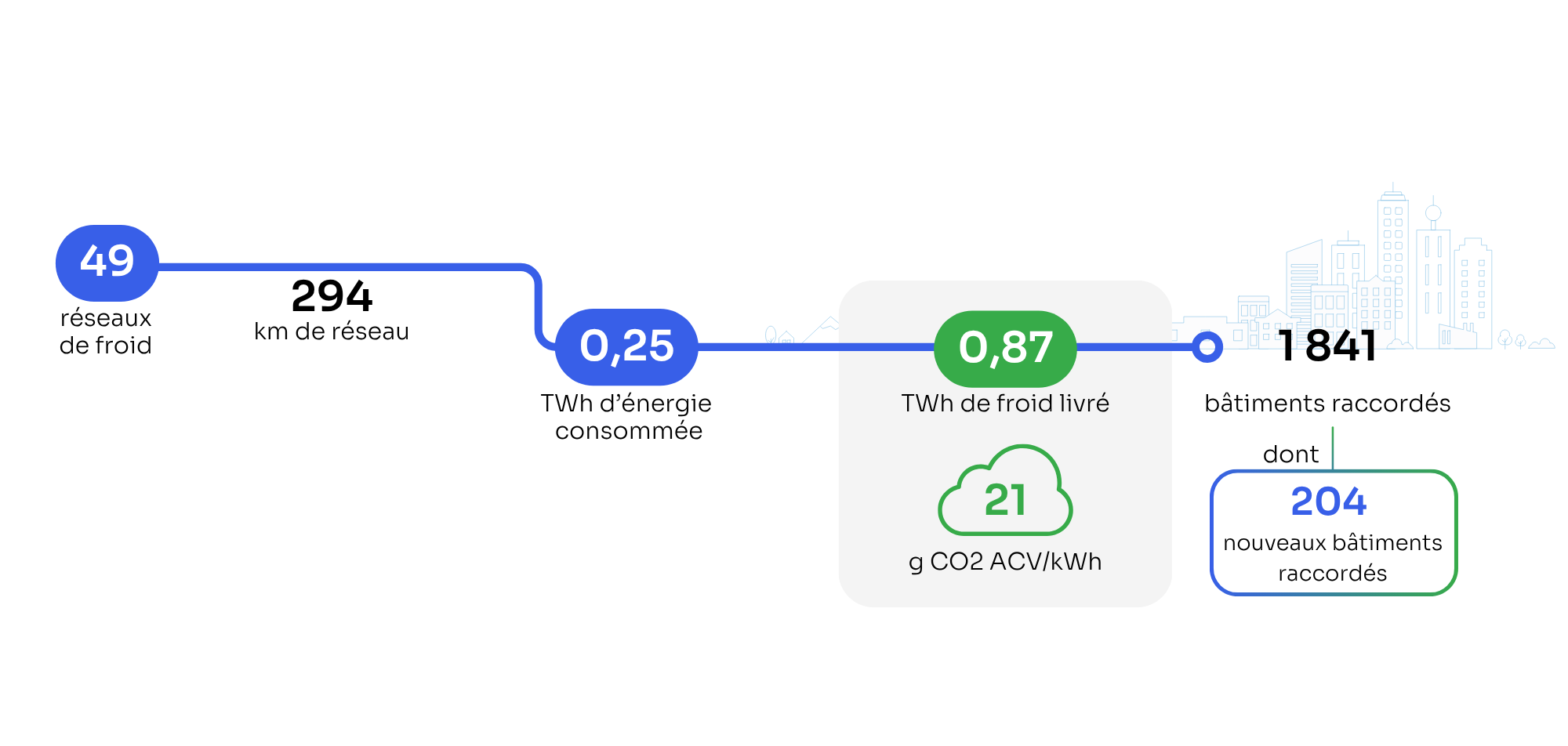 En tout, ce sont 294 km de réseaux de froid qui ont livré 0,9 TWh en 2024. Le Plan national d’adaptation au changement climatique (PNACC) prévoit de doubler la quantité de froid livrée par réseau d’ici 2030.